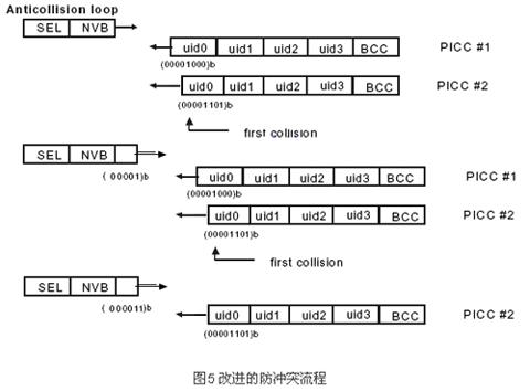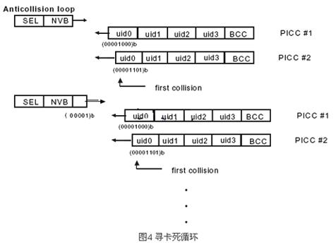 根據(jù)ISO14443協(xié)議,M1型卡傳統(tǒng)的防沖突算法是動(dòng)態(tài)二進(jìn)制檢索樹算法。它首先利用MANCH ESTER編碼“沒有變化”的狀態(tài)來(lái)檢測(cè)碰撞位,然后把碰撞位設(shè)為二進(jìn)制“1”,用SELECT命令發(fā)送碰撞前接收的部分卡片序列號(hào)和碰撞位,如果卡片開頭部分序列號(hào)與其相同,則做出應(yīng)答,不相同則沒有響應(yīng)。以此來(lái)縮小卡片范圍,最終達(dá)到無(wú)碰撞。圖3顯示了兩個(gè)卡片(PICC #1和PICC #2)的防碰撞流程。