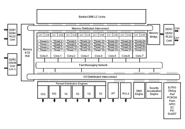 Chuck hill指出,能實現(xiàn)如此高速下的安全功能,得益于它采用了多核MIPS64數(shù)據(jù)包處理器,這是來自Raza 微電子(RMI)的XLR處理器,它最多有8個MIPS64內(nèi)核,可以實現(xiàn)4路多線程,每秒可以處理2000萬個數(shù)據(jù)包。在XLR芯片中集成了可以處理DES、3DES、AES、ARC4、SHA-1、MD5和RSA/DH加密/解密算法的專用安全處理器。1個、2個或4個加密內(nèi)核能使安全引擎提供2.5到10Gbps吞吐量的大塊數(shù)據(jù)加密/解密。安全引擎還包含有用于內(nèi)部IPsec、SSL和其它安全應(yīng)用的隨機(jī)數(shù)字發(fā)生器和RSA/DH求冪算法。Chuck hill表示之所以選中RMI的XLR處理器就是看中了它強(qiáng)大的安全功能。