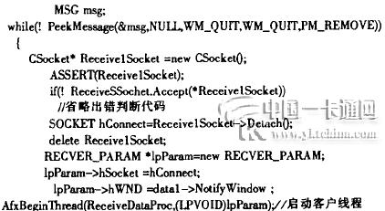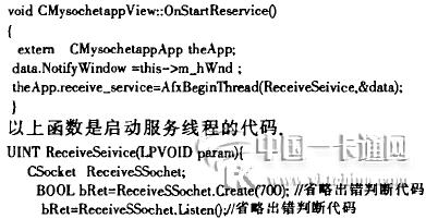 本地服務(wù)器軟件啟動后。首先建立監(jiān)聽服務(wù)線程。用于監(jiān)聽掌上電腦的連接請求.即用來啟動服務(wù)程序.在本軟件中是通過菜單來啟動的.建立一個新的線程使用函數(shù)AfxBeginThread(Re.ceiveSeivice。&data)來實(shí)現(xiàn),第一個參數(shù)為線程函數(shù)的執(zhí)行體的函數(shù)名。第二個參數(shù)為傳遞給此線程的數(shù)據(jù)結(jié)構(gòu)。用于向該線程給出一些具體的數(shù)據(jù).成功執(zhí)行此函數(shù)后.線程函數(shù)便獨(dú)立于主程序運(yùn)行.直至正常退出或被異常中斷.以下是關(guān)鍵代碼: