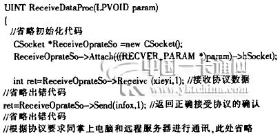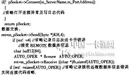 客戶線程啟動后.根據(jù)接收到的套接字句柄建立新的套接字,與掌上電腦端進(jìn)行通訊,接受協(xié)議數(shù)據(jù),根據(jù)協(xié)議數(shù)據(jù)要同遠(yuǎn)程數(shù)據(jù)庫或掌上電腦端進(jìn)行數(shù)據(jù)交流.同遠(yuǎn)程數(shù)據(jù)庫服務(wù)器進(jìn)行數(shù)據(jù)交換是采用ADO組件.以下是關(guān)鍵代碼: