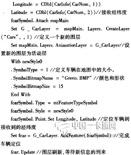 車輛在電子地圖上的實(shí)現(xiàn)是通過增加新的層,并把新層設(shè)置為活動(dòng)層,然后在新層上增加新的特性,新的特性的顏色、形狀、大小可以按照自己的要求定義,最后把它顯示在地圖上。在車輛運(yùn)動(dòng)過程中,根據(jù)接收到的不同信息,可以將車輛定位到不同的位置,然后刷新地圖就能實(shí)現(xiàn)車輛的移動(dòng)。如下面的程序: