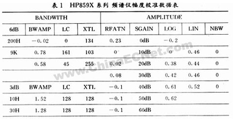 HP859X系列頻譜儀不僅能對儀器各種指標(biāo)進(jìn)行校準(zhǔn),而且還能將各種校準(zhǔn)數(shù)據(jù)存貯在內(nèi)存里,便于操作和維修人員進(jìn)行參考。只要進(jìn)入維修菜單,就能將校準(zhǔn)數(shù)據(jù)顯示出來。具體步驟是:按下菜單〔CAL〕,(MORE),(MORE),(SERVICEDIAG),(DISPLAYCALDATA),這時(shí)頻譜儀的幅度校準(zhǔn)表將顯示在屏幕上,如表1所示。表1是HP8593E頻譜儀出廠的典型幅度校準(zhǔn)數(shù)據(jù)表。