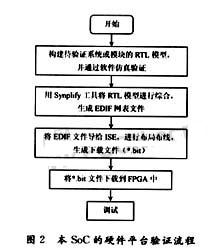在對本SoC進(jìn)行硬件平臺驗證過程中,采用的FPGA綜合工具是Synplicity公司的Synplify Pro 7.7,F(xiàn)PGA布線工具選用的是Xilinx公司的ISE 5.0,硬件平臺的核心FPGA芯片選用的是Xilinx公司的Virtex II系列的XC2V2000。驗證流程如圖2所示[1-3]。