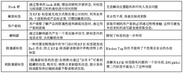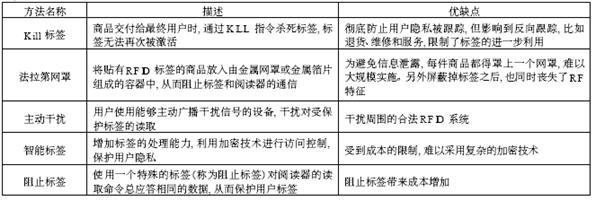 為了防止RFID標(biāo)簽泄露個(gè)人隱私, 同時(shí)也為了防止用戶攜帶安裝有標(biāo)簽的產(chǎn)品進(jìn)入市場所帶來的混亂, 人們從技術(shù)上提出了多種方案, 如表2 所示: