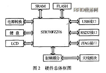 便攜式終端的硬件設(shè)計(jì)包括主控制部分和射頻部分.主控制部分采用ARM微控制器作為核心,用sT公司的STR710FZ2T6芯片來(lái)實(shí)現(xiàn),外部存儲(chǔ)器有5l2 K x 16的SRAM和1 M x 16的FLASH,使用USB主機(jī)接口接入無(wú)線網(wǎng)卡實(shí)現(xiàn)無(wú)線通信功能,同時(shí)還集成了RS232接口、鍵盤和LCD等功能.射頻部分使用NXP公司的MFRC500芯片,連接天線模塊,用來(lái)讀取射頻標(biāo)簽的信息.系統(tǒng)的硬件總體設(shè)計(jì)如圖2所示.