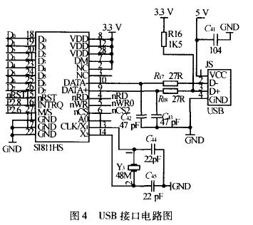 系統(tǒng)及I/O接口采用3.3 V電源供電,內(nèi)核采用內(nèi)嵌的1.8 V電源穩(wěn)壓器供電.它使用0~16 MHz的外部主晶振和32 kHz的外部備用晶振,在內(nèi)部FLASH中運(yùn)行代碼時(shí)可以達(dá)到50 MHz時(shí)鐘頻率,具有4種低功耗模式:SLOW、WFI、STOP和STANDBY.系統(tǒng)軟件要實(shí)現(xiàn)無(wú)線通信、射頻識(shí)別等功能需要較大存儲(chǔ)空間,STR710FZ2T6芯片內(nèi)的64 K RAM滿足不了要求,需要擴(kuò)展一片SRAM,同時(shí)可以支持txCLinux操作系統(tǒng)的運(yùn)行.SRAM采用ISSI公司512 K × 16 的IS61 LV51216,它通過STR710FZ2T6的nCSI信號(hào)選通.為了存儲(chǔ)固化的為了便攜式終端能夠接人無(wú)線局域網(wǎng)和主機(jī)通信,設(shè)計(jì)中使用了現(xiàn)在技術(shù)比較成熟的USB接口無(wú)線網(wǎng)卡.STR7IOFZ2T6芯片上帶有USB設(shè)備接口,但是為了實(shí)現(xiàn)控制無(wú)線網(wǎng)卡需要USB主機(jī)接口,這就要用外接芯片SL811HS來(lái)實(shí)現(xiàn).SLS11HS是CY—PRESS公司生產(chǎn)的、可支持全速數(shù)據(jù)傳輸?shù)腢SB控制芯片,內(nèi)含USB主/從控制器,支持全速和低速數(shù)據(jù)傳輸,并能自動(dòng)識(shí)別低速或全速設(shè)備.SLS11HS所提供的接口遵從USBI.1標(biāo)準(zhǔn),可與微處理器、微控 制器、DSP相連,也可直接與ISA、PCMCIA及其他總線相連.內(nèi)部有一個(gè)256字節(jié)的RAM,可用做控制寄存器或數(shù)據(jù)緩沖器.SLS1 1 HS的復(fù)位引腳是對(duì)芯片的狀態(tài)進(jìn)行復(fù)位,包括了對(duì)芯片內(nèi)部寄存器值的復(fù)位,實(shí)現(xiàn)該操作不需要讀寫接口芯片內(nèi)部寄存器,只需向接口芯片的復(fù)位引腳輸人一個(gè)有效的復(fù)位脈沖即可.SLS11HS可以使用12 MHz和48 MHz 2種晶振,為了提高電路的穩(wěn)定性,這里使用了48 MHz晶振.電路連接如圖4所示.