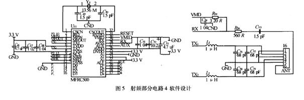VMID用來(lái)提供參考電壓.濾波和電阻轉(zhuǎn)換電路用來(lái)8位并行接口發(fā)送到微控制器,由它來(lái)負(fù)責(zé)進(jìn)一步處理.VMID用來(lái)提供參考電壓.濾波和電阻轉(zhuǎn)換電路用來(lái)抑制高次諧波并優(yōu)化到讀卡器電路的功率傳輸.電路連接參見圖5所示.為低通濾波器,用于濾除13.56 MHz的3次和5次諧波分量.則組成匹配電路. 主要用于耦合卡負(fù)載調(diào)制信號(hào), ∞為分壓器,VMID管腳的電壓可為 管腳提供一個(gè)參考電位.射頻芯片的工作距離主要由天線的大小及匹配電路的修正值所決定.天線本身是一個(gè)低電阻的器件,將天線線圈連接到MFRC500需要一個(gè)匹配電路.通過估算天線的等效電路和計(jì)算品質(zhì)因子可以得出匹配電路的電容推薦值.為了提高天線性能,減小系統(tǒng)體積則單獨(dú)設(shè)計(jì)一塊PCB天線.