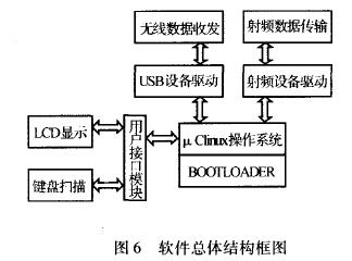 軟件的總體結(jié)構(gòu)如圖6所示.采用U—Boot軟件來(lái)開發(fā)系統(tǒng)的Bootloader,進(jìn)行硬件初始化和引導(dǎo)操作系統(tǒng).STR710FZ2T6運(yùn)行的所有軟件模塊都是基于p~CLinux操作系統(tǒng)的.用戶接口模塊包括2部分,分別完成LCD顯示和掃描鍵盤輸入的功能.編寫USB設(shè)備驅(qū)動(dòng)和射頻芯片驅(qū)動(dòng),分別完成控制無(wú)線網(wǎng)卡與管理服務(wù)器通信和射頻數(shù)據(jù)傳輸.