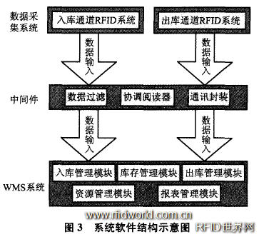 配送系統(tǒng)的軟件結(jié)構(gòu)由前端各個(gè)區(qū)域的RFID數(shù)據(jù)采集系統(tǒng)、中間件、以及后端的倉儲(chǔ)管理系統(tǒng)(wMS)構(gòu)成。系統(tǒng)軟件結(jié)構(gòu)如圖3所示。