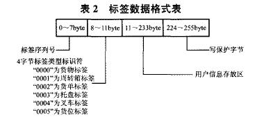 綜合考慮各種因素,本文認(rèn)為第三種方法最為恰當(dāng),雖然標(biāo)簽讀取速度稍有犧牲,但對(duì)于通常配送中心的物流速度而言不會(huì)構(gòu)成負(fù)面影響。通常ISO電子標(biāo)簽內(nèi)部存儲(chǔ)容量為2048bits,被分成256個(gè)字節(jié),每個(gè)字節(jié)有一個(gè)對(duì)應(yīng)地址0~255。設(shè)置標(biāo)簽的數(shù)據(jù)格式如表2所示。