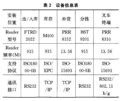 為支持此項(xiàng)研究,我們?cè)趯?shí)驗(yàn)室中特建立一套小型配送中心,其基本物流設(shè)備包括橫梁式貨架、流利式貨架、可變速傳輸線以及叉車等,并依據(jù)配送中心典型布局設(shè)置了出入口、分揀區(qū)、補(bǔ)貨區(qū)、倉儲(chǔ)區(qū)等不同的功能區(qū)域。按照本文的系統(tǒng)設(shè)計(jì)思想,我們?cè)诟鱾€(gè)RFID通道配置了相應(yīng)的RFID設(shè)備并分別與中心計(jì)算機(jī)相連進(jìn)行數(shù)據(jù)通訊。RFID設(shè)備基本信息如表2。其中為節(jié)省設(shè)備資源,出入庫區(qū)域用同一設(shè)備的不同天線分別用作入庫和出庫操作。
