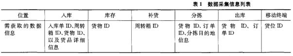 3 系統(tǒng)數(shù)據(jù)獲取方法研究要實(shí)現(xiàn)配送中心高效、自動(dòng)地正常運(yùn)轉(zhuǎn),需要在配送中心的各個(gè)工作環(huán)節(jié)獲取指定數(shù)據(jù)信息,需要采集的詳細(xì)信息如表1。
