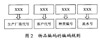 為實現(xiàn)真正的“一物一碼”,編碼原則采用了EPC(electron production code)碼[3] 。由于EPC碼是物品本身具有的屬性,即物品在出廠時會由生產(chǎn)廠商對其進行EPC編碼,寫入到電子標(biāo)簽中。而EPC編碼是在生產(chǎn)廠商加入EPC global組織后,由組織給生產(chǎn)廠商分配一個編碼的空間以及一些編碼規(guī)則,讓企業(yè)自行編碼。本系統(tǒng)為方便操作,只定義了12位二進制位的編碼。編碼規(guī)則如圖2所示。