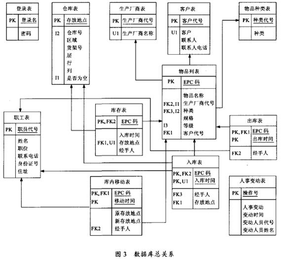 數(shù)據(jù)庫中表的關(guān)系如圖3所示。它描述了數(shù)據(jù)庫中所有的表以及這些表之間的關(guān)系。對于表之間的觸發(fā)器、為程序設(shè)計的存儲過程、約束等具體內(nèi)容這里沒有詳細(xì)列出。