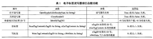 本文采用C#語言編程,通過調(diào)用基于COM 組件的In—terop.vtComRFID.d11動態(tài)庫文件的5個主要接口函數(shù)實現(xiàn)物流控制及管理系統(tǒng)與讀寫器的通信,接口函數(shù)的主要功能如表1所示。通信內(nèi)容為物品編碼。