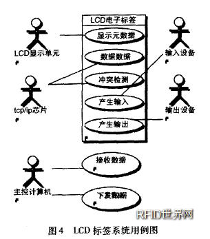 圖3為基于TCP/IP的以太網(wǎng)LCD電子標(biāo)簽的硬件結(jié)構(gòu),主要由LCD顯示單元、TCP/IP通信芯片、輸入設(shè)備(如:按鈕、鍵盤)、輸出設(shè)備(如:揚(yáng)聲器、四色燈等)以及其他外設(shè)和單片機(jī)/DSP以及其他服務(wù)電路組成。整個(gè)系統(tǒng)的用例圖如圖4所示。