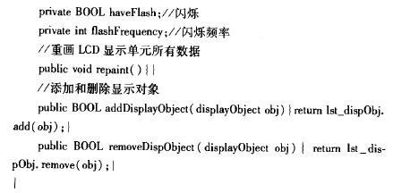 由于我們采用的LCD顯示單元,其顯示內(nèi)容豐富,能顯示數(shù)字、字符、圖形、圖片等絕大部分?jǐn)?shù)據(jù),并且支持彩色顯示。本部分的封裝是整個(gè)系統(tǒng)的核心和關(guān)鍵,因此我們在設(shè)計(jì)時(shí)采用了Composite模式,將文本、直線、圓、矩形、圖片等分別封裝成對象,通過一個(gè)公共的抽象類displayObject的接口來實(shí)現(xiàn)各自在LCD顯示單元上的重畫(paint)功能,將這些對象的公共屬性存放于接口中,而各自的個(gè)體屬性則分別放于各自的類定義中。