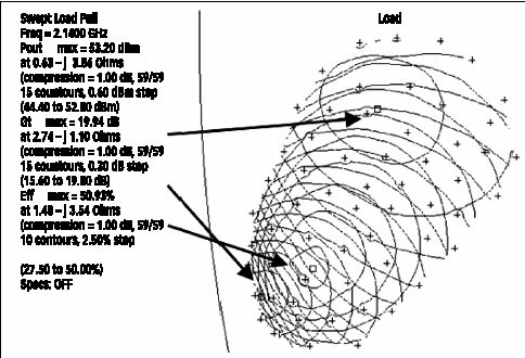 脈沖VNA負(fù)載拉移技術(shù)被用來測(cè)量飛思卡爾公司廣泛的功率晶體管產(chǎn)品,包括170W WCDMA器件MRF7S21170H。該器件的負(fù)載拉移功率等高線顯示,1dB壓縮點(diǎn)的脈沖輸出功率高于+53dBm(200W),2.14GHz頻率下的增益為19.94dB(圖5)。由于具有這些技術(shù),MRF7S21170H的最終匹配網(wǎng)絡(luò)設(shè)計(jì)變成非常簡(jiǎn)單,只需為同時(shí)優(yōu)化功率密度、增益、效率,以及綜合的匹配網(wǎng)絡(luò)而選擇負(fù)載和源阻抗。
