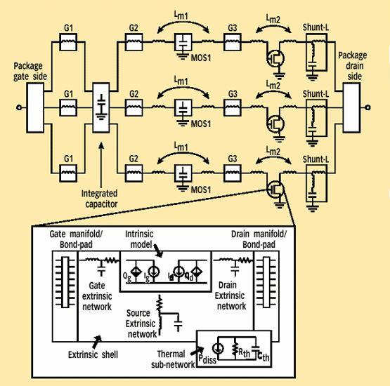 開發(fā)這些封裝晶體管的非線性電熱模型,使最復(fù)雜的測(cè)量和仿真技術(shù)成為可能。成功的建模還必須解決一些問題,包括匹配網(wǎng)絡(luò)中組成部分之間以及邦定線陣列之間的電磁交互作用、熱管理、器件熱模型與電模型的自相容集成,以及建立晶體管本身的非線性模型等。