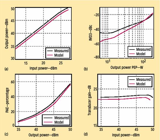 當(dāng)模型生成之后,通過比較模型預(yù)測(cè)與在模型生成中未被采用的獨(dú)立測(cè)量數(shù)據(jù),開始確認(rèn)模型工作的最后步驟。飛思卡爾基于其負(fù)荷拉移測(cè)量能力,制訂出一套行之有效的方法來確認(rèn)它的大信號(hào)模型。本質(zhì)上說,CAD工具被用來模仿大功率器件在負(fù)載拉移測(cè)試期間觀察到的環(huán)境。在非線性諧波平衡仿真過程中,對(duì)基頻和諧波頻率下的待測(cè)器件(DUT)的負(fù)載拉移S參數(shù)進(jìn)行同步,以提出負(fù)載阻抗。測(cè)量和建模能力的配合有助于優(yōu)化模型,以匹配測(cè)量結(jié)果。 圖8和圖9是與圖6類似的硅LDMOS晶體管模型確認(rèn)的例子。該器件已經(jīng)被設(shè)計(jì)用于860和960MHz頻段N-CDMA、GSM和GSM/EDGE基站應(yīng)用,且在典型的GSM應(yīng)用中具有28V電源電壓和1,200mA靜態(tài)漏電流。該晶體管在1dB壓縮點(diǎn)能提供160WCW功率。該晶體管包括三個(gè)有源裸片,具有大約270mm的柵長(zhǎng)。封裝中包括了輸入匹配網(wǎng)絡(luò),這個(gè)T型網(wǎng)絡(luò)采用78個(gè)邦定線和MOS電容。組成組成部分的模型如前所述,然后利用這些組成部分構(gòu)建完整的模型。確認(rèn)部分包括了大信號(hào)模型和雙音仿真,它在脈沖條件下實(shí)現(xiàn),以提供恒溫環(huán)境。在同樣熱條件以及輸入和輸出負(fù)載條件下進(jìn)行了負(fù)載拉移測(cè)量,并將測(cè)試結(jié)果與仿真結(jié)果比較。輸出功率、三階互調(diào)失真(IM3)、功率附加效率(PAE)以及轉(zhuǎn)換器增益的測(cè)量和仿真如圖8和9所示。采用分別在最大功率附加效率和最大輸出功率下諧振的已封裝晶體管,來實(shí)現(xiàn)功率掃描或拉升測(cè)量。在測(cè)試條件范圍內(nèi),測(cè)量和仿真結(jié)果非常吻合。