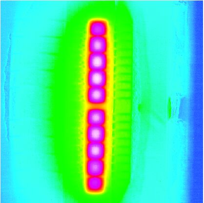 為獲得封裝晶體管的熱阻,飛思卡爾制訂了一套嚴(yán)格的方法,采用紅外線(IR)顯微鏡來測(cè)量工作在實(shí)際節(jié)點(diǎn)阻抗和信號(hào)激勵(lì)下的晶體管裸片的溫度。在顯微鏡下,裸片的溫度分布可以被看成是功率大小、偏置、匹配條件、頻率,甚至是所選擇的調(diào)制方式(例如WCDMA或IS-95)的函數(shù)。晶體管消耗60W功率的IR圖像照片如圖11所示。