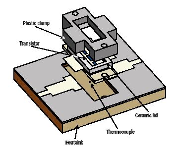 使用IR顯微鏡可以定位出測(cè)量區(qū)域的最大裸片表面溫度。在熱測(cè)量期間,可以確定封裝晶體管的底部的溫度,并通過熱電偶進(jìn)行監(jiān)測(cè),或者直接在晶體管的活動(dòng)單元或產(chǎn)生熱的區(qū)域進(jìn)行定位,如圖12所示。可通過在晶體管的陶瓷蓋上鉆孔,或者除去蓋子來直接觀察裸片表面。對(duì)OMP封裝,可以刻蝕掉模壓封裝使裸片的表面暴露出來。