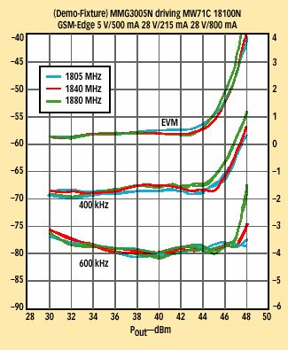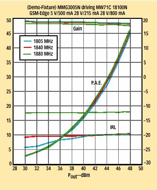 圖13為其中一個(gè)示范電路。這個(gè)電路被用來演示完整的1,800MHz GSM產(chǎn)品系列,包括驅(qū)動(dòng)MW7IC18100N大功率RF的ICMMG3005 GPA。MMG3005是A類偏置InGaP HBTC,在1dB壓縮下具有+30dBm額定輸出功率。MW7IC18100N是HV7 LDMOS兩級(jí)RF IC,在1dB壓縮下具有100W(+50dBm)的額定輸出功率。綜合來看,這兩個(gè)器件創(chuàng)建了高性能的1,800MHz GSM系統(tǒng),具有近50dB的增益、37%的線路效率,以及+46dBm輸出功率下的1.5% EVM性能,如圖14和15所示。低成本塑料封裝、緊湊的電路版圖以及使用最少的RF器件使得這一應(yīng)用為成本敏感的GSM市場(chǎng)提供了理想的解決方案。