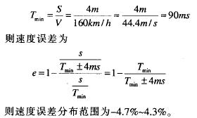 2) 檢測速度誤差:每路線圈檢測計(jì)數(shù)時間約為2.5ms,達(dá)到計(jì)數(shù)值后單片機(jī)定時器記錄時間值,然后進(jìn)行判斷等操作,這段處理程序大約300500行,按一行 C語言折合3行匯編指令算,最多1500條指令,指令周期為lus,時間需要1500x1us=1.5ms,可得出每路檢測時間約為4ms,即最大時間誤差為4ms。速度線圈對著的中心間距為4m,按檢測速度160km/h計(jì)算,則通過兩線圈最短時間為: