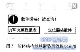 (5)預(yù)警子系統(tǒng)。該子系統(tǒng)主要處理對(duì)漏裝結(jié)構(gòu)散件的安裝提示l_L作,其內(nèi)容包括:根據(jù)RFID終端采集的數(shù)據(jù)與系統(tǒng)基礎(chǔ)數(shù)據(jù)的對(duì)比,提示相關(guān)結(jié)構(gòu)散件的補(bǔ)裝工作,并給出具體的安裝提示信息,包括安置的結(jié)構(gòu)散件和安裝位置等。它的主要功能有漏裝結(jié)構(gòu)散件預(yù)警提示以及部件安裝信息提示。