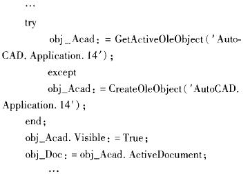 (2)Delphi前臺(tái)開發(fā)與AutoCAD-I 具軟件的接口。AutoCAD從R14版開始引入了Automation技術(shù),它把全部的系統(tǒng)功能和函數(shù)打包成為一個(gè)名為AutoCAD.Application.1 4的Automation Server對(duì)象。通過這個(gè)對(duì)象,應(yīng)用程序可以訪問Auto—CAD全部功能。本系統(tǒng)軟件的開發(fā)對(duì)于此部分的接口擬采用該種方式予以實(shí)現(xiàn)。