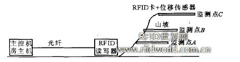 系統(tǒng)總體由位移傳感器、射頻識(shí)別系統(tǒng)(RFID)和主控機(jī)房構(gòu)成。其工作原理為:將帶有RFID卡的位移傳感器植入山坡的監(jiān)測(cè)點(diǎn)A、B、C等中。當(dāng)其中某點(diǎn)發(fā)生位移時(shí),其相應(yīng)的RFID卡將會(huì)發(fā)射攜帶有自身唯一標(biāo)識(shí)的ID號(hào),RFID讀寫器會(huì)接收到這些信息并通過網(wǎng)絡(luò)傳入到主控機(jī)房主機(jī)中,供監(jiān)控人員處理。其原理如圖1所示。