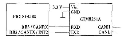 2.1 PICl8F458O與CTM825lA 的接口電路PIC18F4580帶有CAN控制模塊,支持CAN1.2、CAN2.0A、CAN2.0B協(xié)議,只需外接CAN驅動器即可實現(xiàn)CAN模塊的硬件設計,接口電路如圖3所示。CAN發(fā)器芯片CTM8251A具有DC 2 500 V隔離功能,符合ISO 11898標準,數據速率最高達1Mbps,具有自動熱關斷保護功能,并且未上電或欠壓節(jié)點不會影響CAN總線的正常工作。