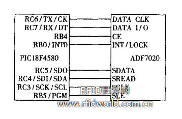 圖4為MCU與射頻收發(fā)模塊的接口電路。PIC18F4580單片機通過ADF7020的串行數據輸入引腳SDATA向ADF7020發(fā)送編程控制字,控制其工作方式,并可以通過串行數據讀回引腳SREAD讀取ADF7020的工作狀態(tài),SLE引腳作為控制字的鎖存信號。DATA I/O引腳是發(fā)送信號輸入和接收信號輸出分時復用引腳,收發(fā)工作在半雙工方式,因此MCU工作在半雙工的同步通信模式下,通過串行同步接口接收或發(fā)送數據。當ADF7020接收到一個來自天線的有效信號后,通過INT/LOCK引腳向MCU發(fā)出中斷信號。