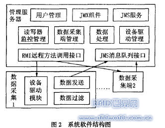 本系統(tǒng)基于J2EE技術開發(fā),其中組件管理基于JMX管理框架,包括:讀寫器組件、數(shù)據(jù)采集端組件、數(shù)據(jù)處理組件等;RFID數(shù)據(jù)消息的傳遞基于JMs消息服務體系。