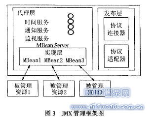 讀寫器監(jiān)控和管理模塊基于JMX管理框架,將讀寫器開發(fā)包用統(tǒng)一接口進行封裝,并將接口方法作為RMI遠程方法發(fā)布。對讀寫器的控制是在管理服務器中進行的,將對讀寫器的遠程方法調(diào)用封裝為一個MBean組件,注冊到服務器中的JMBeanServer中,這樣可以通過JMX管理框架來監(jiān)控管理讀寫器。通過封裝,以編程的方式彌補了不同廠商讀寫器開發(fā)包不同的差異,將對讀寫器的控制封裝成接口統(tǒng)一的MBean組件。另外,JMX管理框架還提供時間服務、通知服務、監(jiān)視服務和角色服務等服務。JMX管理框架如圖3所示。