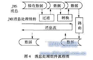 數(shù)據(jù)消息處理模塊基于JMS消息服務體系,這種組件體系結構將支持任意數(shù)據(jù)處理過程。業(yè)務分析人員可以對數(shù)據(jù)處理過程進行建模。一個數(shù)據(jù)處理過程實際上就是一些步驟的聚集。這些步驟包括數(shù)據(jù)過濾、格式轉換、路由等。每一個類別將被抽象,并且建模成為一個JMX組件,如圖4所示的消息處理組件的流程。