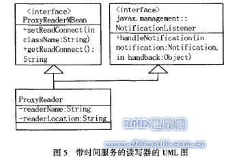 在本系統(tǒng)中將每個讀寫器模塊的遠程方法調(diào)用封裝為一個管理組件(MBean)作為JMX服務器的實例注冊到JMX服務器中。通過JMX框架對讀寫器進行監(jiān)控和管理,使RFID中間件系統(tǒng)能提供管理、監(jiān)控讀寫器的功能。本部分描述為讀寫器管理組件添加時間服務,以達到定時控制讀寫器的目的。JMX時間服務在指定的日期和時間觸發(fā)消息;也可以在一個固定間隔重復觸發(fā)消息。時間服務由一個MBean實現(xiàn)并可以管理,能夠發(fā)送它指定的TimerNotification類的消息實例。javax.management.NotificationListener由想要接收通知的對象來實現(xiàn),實現(xiàn)方法handleNotification。對于定期通知,則使用固定延遲執(zhí)行方案,如在Timer中指定的那樣。為了使用固定速率執(zhí)行方案,要使用addNotification方法。圖5為讀寫器時間服務的UML設計圖。
