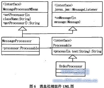 下面將描述創(chuàng)建一個MBean來實現(xiàn)一個數(shù)據(jù)處理節(jié)點。消息組件可以按照MBean來部署。消息處理組件執(zhí)行功能:從源隊列中獲取消息,對消息執(zhí)行處理,然后將結果消息放置到目標隊列。圖6顯示了這個組件的UML設計。