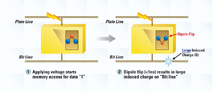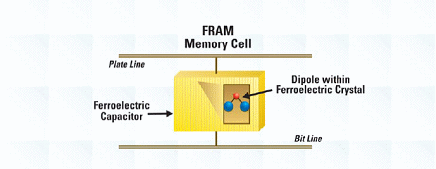 FRAM為一非揮發(fā)性的內(nèi)存,如EEPROM,然而其僅有此一相似點(diǎn)。 FRAM使用微小的鐵晶體管并且整合于電容。雖然ferro代表鐵,但 FRAM并未包含鐵,因此鐵晶體管不具電場傳導(dǎo)性,因此不具磁鐵的相斥性。FRAM與EEPROM及閃存復(fù)雜的閘極組件儲存方式不同,是經(jīng)由鐵晶體管自發(fā)性的穩(wěn)定雙極儲存,實(shí)際上,鐵晶體管中的雙極原子皆有正極或負(fù)極。(請參閱圖1)