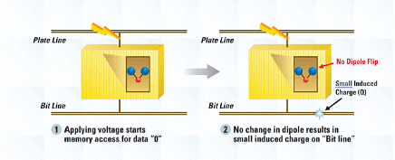 如圖2所標(biāo)示,F(xiàn)RAM的記憶格包含由電路板線及位線連接的鐵電電容。在鐵晶體管中的雙極形成電容材料可經(jīng)由外部電壓跨越任一條線加以設(shè)定或逆轉(zhuǎn)。