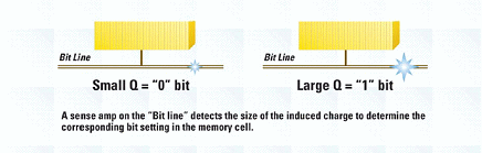 圖5、位在線的感應(yīng)放大器偵測到感應(yīng)電荷的大小,并決定于記憶格設(shè)定相關(guān)的位。