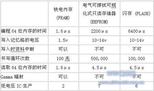 與一般用于制造智能IC的180奈米制程節(jié)點(diǎn)相比,以130奈米制程節(jié)點(diǎn)制造的芯片,每單位面積可放置兩倍的晶體管。以130奈米制程制造FRAM ,可較傳統(tǒng)的嵌入式內(nèi)存技術(shù)法放置更多的內(nèi)存于更小的IC上,且所需的功耗也較低。表1比較以130奈米制造的嵌入式FRAM與傳統(tǒng)嵌入式的非揮發(fā)性內(nèi)存技術(shù)制造的EEPROM及閃存的被動組件。