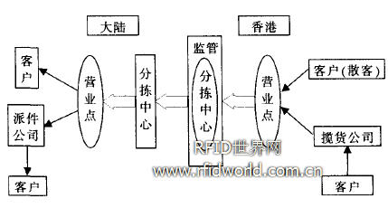 從香港過來的快件,需兩張條形碼。其中一張是貨單,也就是用于記錄客戶信息和交接以及財(cái)務(wù)結(jié)算的號(hào)碼:另外一張就是海關(guān)清關(guān)所需的條形碼,當(dāng)香港營業(yè)點(diǎn)接收到快件業(yè)務(wù)要進(jìn)入大陸時(shí)。快件公司先將進(jìn)口貨物的品名、重量、價(jià)格等信息事先提交到海關(guān)的網(wǎng)絡(luò)信息系統(tǒng),然后再從網(wǎng)上下載海關(guān)批準(zhǔn)的貨物清單,而這清單就是通關(guān)時(shí)的海關(guān)監(jiān)管憑據(jù):當(dāng)貨物到達(dá)監(jiān)管中心時(shí),由海關(guān)工作人員取下封條,貨物陸續(xù)通過海關(guān)的X光檢測(cè)系統(tǒng)。當(dāng)貨物的實(shí)際情況與申報(bào)相同時(shí),貨物就順利通關(guān):若某件貨物與申報(bào)不符時(shí),系統(tǒng)就將貨物自動(dòng)彈出,通過流水線到達(dá)海關(guān)查驗(yàn)中心并進(jìn)行人工查驗(yàn)。貨物查驗(yàn)結(jié)束后,不合格貨物被扣留在監(jiān)管倉,合格貨物就通過快件公司的車輛運(yùn)達(dá)快件公司的分揀中心。在分揀中心,通過人工識(shí)別貨單條碼,按派送地區(qū)分類裝車,送到各個(gè)地區(qū)的營業(yè)點(diǎn)上。最后派送到客戶手中完成快件運(yùn)輸?shù)娜苛鞒獭H鐖D2所示。