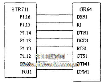 我們將STR71 1FR2與GR64結(jié)合使用。兩個芯片聯(lián)合工作時,主要注意幾個控制信號的連接和使用,主要有RI、CTS、DSR、DCD、RTS、DTR這幾個信號,其電路原理圖如圖2所示。另外,乘客信息接收接口主要是按鍵直接接到ARM的端口上,RFID模塊通過RS一232與ARM交換信息,顯示屏主要是一些高亮度LED發(fā)光二極管,直接由ARM的端口線控制。
