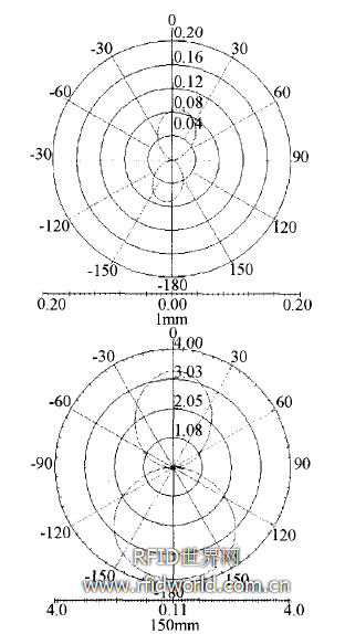 在天線旁邊平行放置一個(gè)200 mm×200 mm的金屬板。與金屬板相距1 mm和150 mm的方向圖仿真結(jié)果如圖7,相距1 mm時(shí),增益為5.38 dBi,增益很高,但幾乎沒有輻射場,距離150 mm時(shí),增益2.45 dBi,輻射場較強(qiáng)。可以看出,標(biāo)簽天線和金屬距離很近時(shí),天線的方向性會(huì)增強(qiáng)。