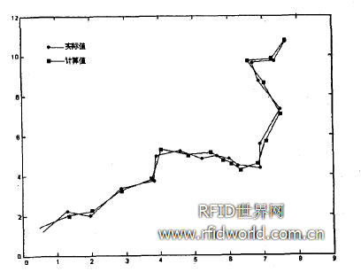 圖3中的坐標(biāo)單位為m,圖中圓點(diǎn)為機(jī)器人實(shí)際的位置坐標(biāo)點(diǎn),方塊點(diǎn)是用定位算法計(jì)算出的機(jī)器人相應(yīng)坐標(biāo)點(diǎn).從實(shí)驗(yàn)結(jié)果可以看出,本文提出的基于RFID系統(tǒng)的定位算法能夠較準(zhǔn)確的計(jì)算出機(jī)器人的位置坐標(biāo)。