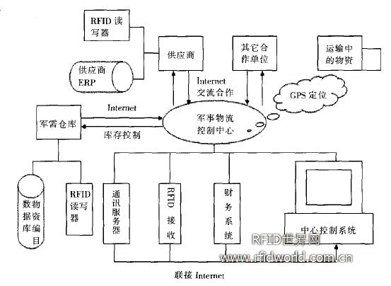 由圖3所示可以看出,RFID技術(shù)及其與相關(guān)部件組成的射頻識(shí)別伴隨著軍事物流的各個(gè)環(huán)節(jié):從物資產(chǎn)品由供應(yīng)商提供給部隊(duì)。再到物資的庫(kù)存管理,以及運(yùn)輸過程中,RFID電子標(biāo)簽一直附著在物資產(chǎn)品上,且存儲(chǔ)信息不斷更新 每個(gè)過程都記人RFID電子標(biāo)簽之中,這就為實(shí)現(xiàn)軍事物流全程可視化提供了保證。而且,如果在車輛上也安裝有電子標(biāo)簽識(shí)別器的話,還可以隨時(shí)檢查車載物資安全狀態(tài);實(shí)現(xiàn)物資保障可視化的另一個(gè)重要前提就是,RFID電子標(biāo)簽所記錄的信息要經(jīng)Internet網(wǎng)進(jìn)行傳輸。同時(shí),在途運(yùn)輸時(shí)還需要軍用GPS來隨時(shí)準(zhǔn)確地掌握車輛所處的位置及行駛狀態(tài)。這樣,管理者只需在辦公室即可隨時(shí)掌控或調(diào)整車輛行進(jìn),特別對(duì)于作戰(zhàn)背景下的軍需保障,GPS的使用顯然可以大大提高軍事物流的準(zhǔn)確性和準(zhǔn)時(shí)性。