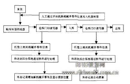 同樣的問題相信在機(jī)械手零件產(chǎn)品上也存在,為此,設(shè)想利用RFID技術(shù)提出以下解決方案。首先,在進(jìn)出機(jī)械手零件倉庫的每個托盤上貼上一張UHF的標(biāo)簽,在進(jìn)出倉庫的門上都裝有讀寫器,每個倉庫管理員有一臺手持機(jī),這手持機(jī)同時帶紅外采集功能。這樣,每批機(jī)械手零件入倉前,倉庫管理員用手持機(jī)掃描每個托盤上機(jī)械手零件的條碼,記錄機(jī)械手零件,同時通過RFID寫入機(jī)械手零件下 面托艋上的標(biāo)簽里,當(dāng)這一托盤的機(jī)械手零件進(jìn)入倉庫時,門上的讀寫器就會把標(biāo)簽上的機(jī)械手零件信息直接讀取出來,存入電腦中,后臺的信息管理系統(tǒng)會自動生成記錄,且準(zhǔn)確地記載這批機(jī)械手零件放在倉庫的哪個位置,就不再出現(xiàn)要出貨時,需要倉管人員一排一排地去找了。如果有人將托盤推出倉庫,后臺系統(tǒng)會立刻顯示出這些機(jī)械手零件己出倉,并自動生成時間記錄。這樣就不會出現(xiàn)由于倉管人員的疏忽而忘了把信息輸入電腦,在出了問題以后難查數(shù)據(jù)的麻煩了,而如果倉管人員本身就不會電腦操作也不會為信息化管理產(chǎn)生問題。以此類推,如果在每件機(jī)械手零件上均貼上UHF標(biāo)簽,那每件機(jī)械手零件進(jìn)出倉庫均會立刻在后臺系統(tǒng)上顯示,優(yōu)化了整個管理程序,減少了管理過程中人為因素的錯誤發(fā)生率,也節(jié)省了管理人工成本。如圖3例所示整個機(jī)械手零件供應(yīng)鏈管理的流程被簡化,也更加科學(xué)。