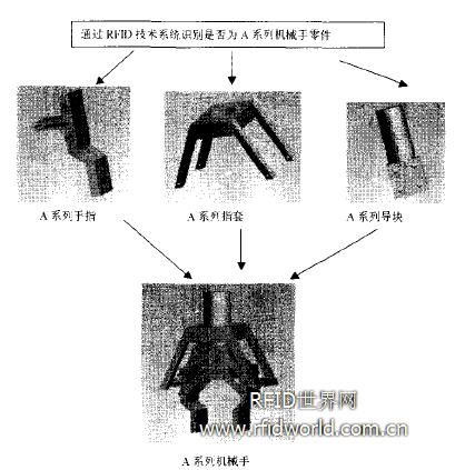 同樣的,在裝配線上的也可以利用RFID技術(shù)來管理。例如要裝配一套型號為A 的機(jī)械手,如圖2,通過識別RFID標(biāo)簽上的型號信息來判斷是否是要進(jìn)行裝配的零件 型號,如果是,就投入下一道工序等待裝配,如果不是,就篩選掉。