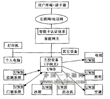 家電網(wǎng)絡(luò)的設(shè)備主要是信息家電,而嵌入式軟件、可編程邏輯器件和DSP芯片技術(shù)是信息家電的核心,信息家電平臺(tái)技術(shù)也是家庭網(wǎng)絡(luò)的關(guān)鍵技術(shù)之一 。本文在基于智能卡技術(shù)和UWB通信標(biāo)準(zhǔn)的基礎(chǔ)上,實(shí)現(xiàn)對(duì)各信息家電的遠(yuǎn)程控制,同時(shí)為通信網(wǎng)絡(luò)之間的數(shù)據(jù)交換以及信息共享等提供安全保障。基于智能卡和UWB技術(shù)的遙控信息家電網(wǎng)絡(luò)結(jié)構(gòu)如圖2所示。
